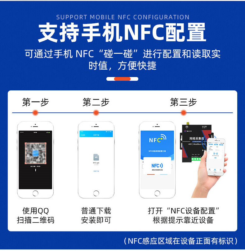 网络采集器是一款数据采集设备,可通过 485 总线可将我司所有的 RS485 型的变送器(温湿度、雨雪、风速风向等)接入采集器,最可连接 8 台 485 型设备,并通过 4G 将数据实时上传至我司提供的免费云平台或者客户自己的服务器。设备支持 NFC 近场通讯技术,可通过手机“碰一碰 NFC 配置”和设备“碰一碰”快速且方便的配置参数。