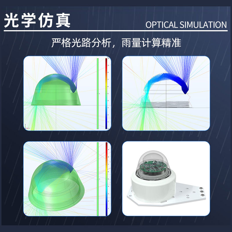 此款雨量计采用光学感应原理实现对降雨量的测量:光学雨量传感器体积更小、更灵敏可靠,更智能,易维护。