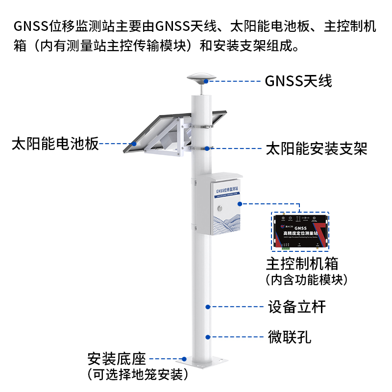 GNSS位移监测站主要由GNSS天线、太阳能电池板、主控制机箱(内有主控传输模块)和安装支架组成,分为基准站和测量站。该设备可通过 4G、以太网两种方式,将数据上传至环境监控平台,采用太阳能供电的方式,安装不受地域地形的限制。适用于地表位移监测和建筑物的形变监测,如滑坡、边坡位移、桥梁形变、水库大坝、矿山地质灾害等。