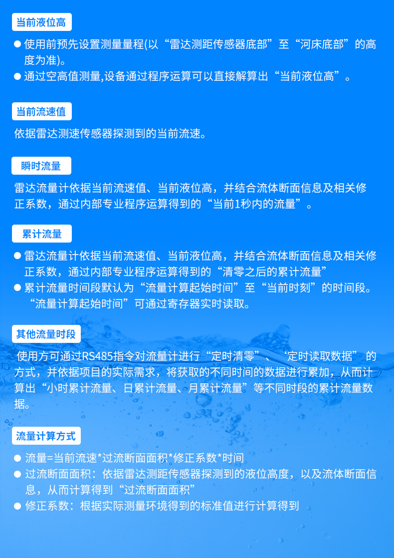 雷达流量计系列产品,配合本公司水雨情立杆、主机使用,防护等级 IP68。可检测水流速、水位高度。485 通信,标准 ModBus-RTU 通信协议,最远通信距离 2000 米,产品供电为10-30V 宽电压供电,主要应用于水渠、河流等需要流量及水位监测的场合。