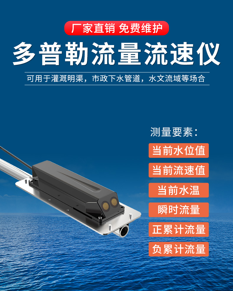 多普勒流量流速仪综合声学多普勒效应、静水压力测量、温度修正补偿等多种技术思路于一体,可同时测量流体的流速、水位、水温等水文要素,并结合流体断面信息及相关修正系数,通过内部专业程序运算得到瞬时流量、累计流量。依赖性,被广泛应用于灌溉明渠,城市地下管网、水库、水闸、渠道等水利工程。