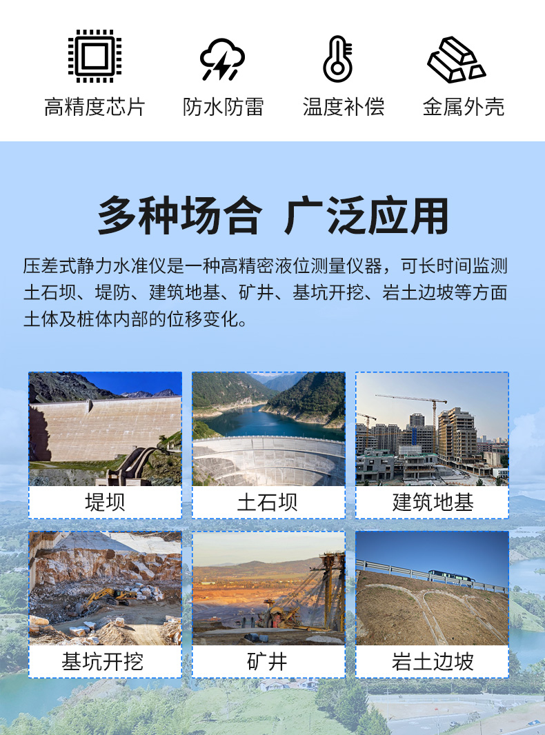 压差式静力水准仪是一种高精密液位测量仪器,基于连通器原理通过测量各测点相对于基准点的液位变化来反映地面沉降变化,可长时间监测土石坝、堤防、建筑地基、矿井、基坑开挖、岩土边坡等方面土体及桩体内部的位移变化,为工程安全监测提供可靠数据支持。
