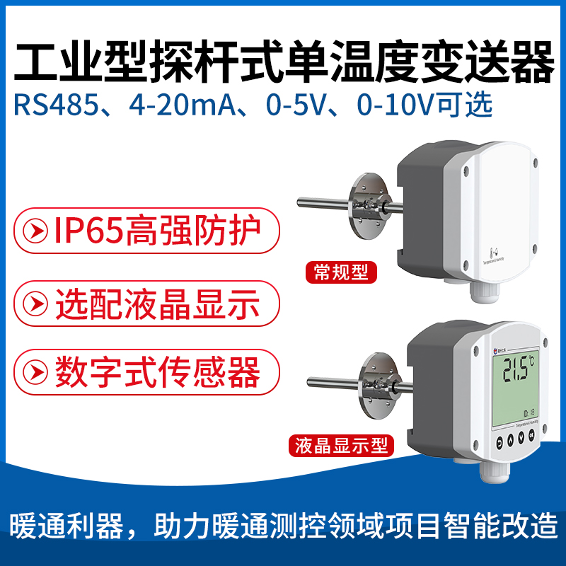 工业探杆式单温度变送器采用我公司最新的温度测量技术,支持RS485、模拟量登多种信号输出方式。助力暖通测控领域项目智能改造,广泛应用于楼宇自控领域控制和限定供水温度、回水温度、生活热水温度等场合。