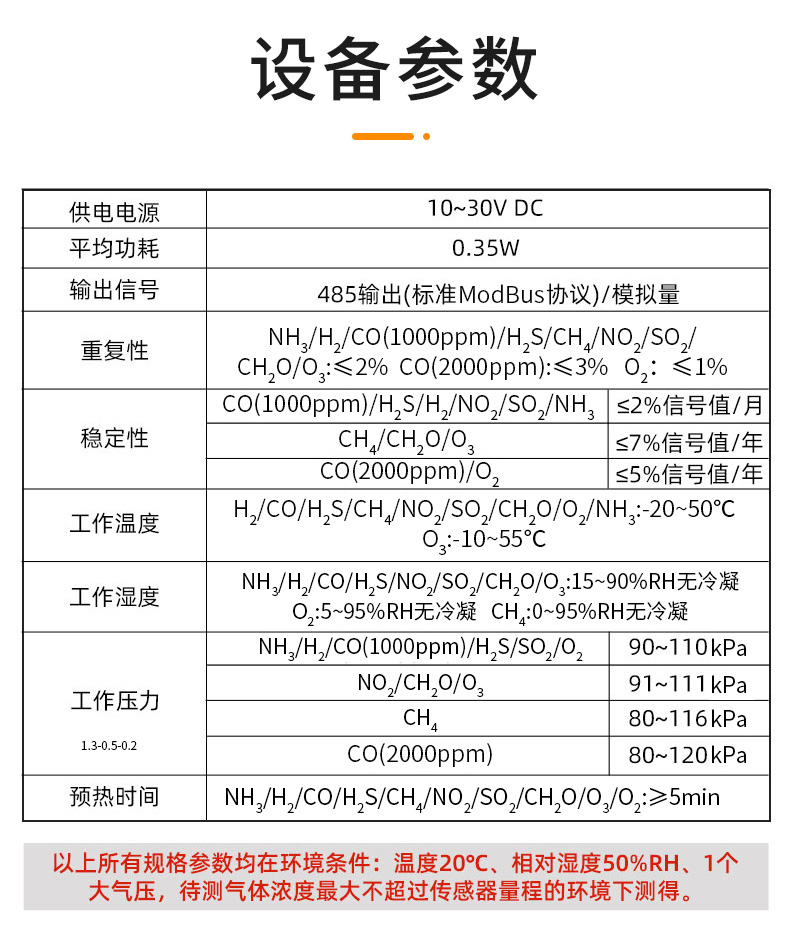 以上所有规格参数均在环境条件:温度20℃、相对湿度50%RH、1个大气压,待测气体浓度最大不超过传感器量程的环境下测得。以上陈述的性能数据是在使用我公司测试系统及软件的测试条件下获取的。为了持续改进产品,我公司保留更改设计功能和规格的权利,恕不另行通知。