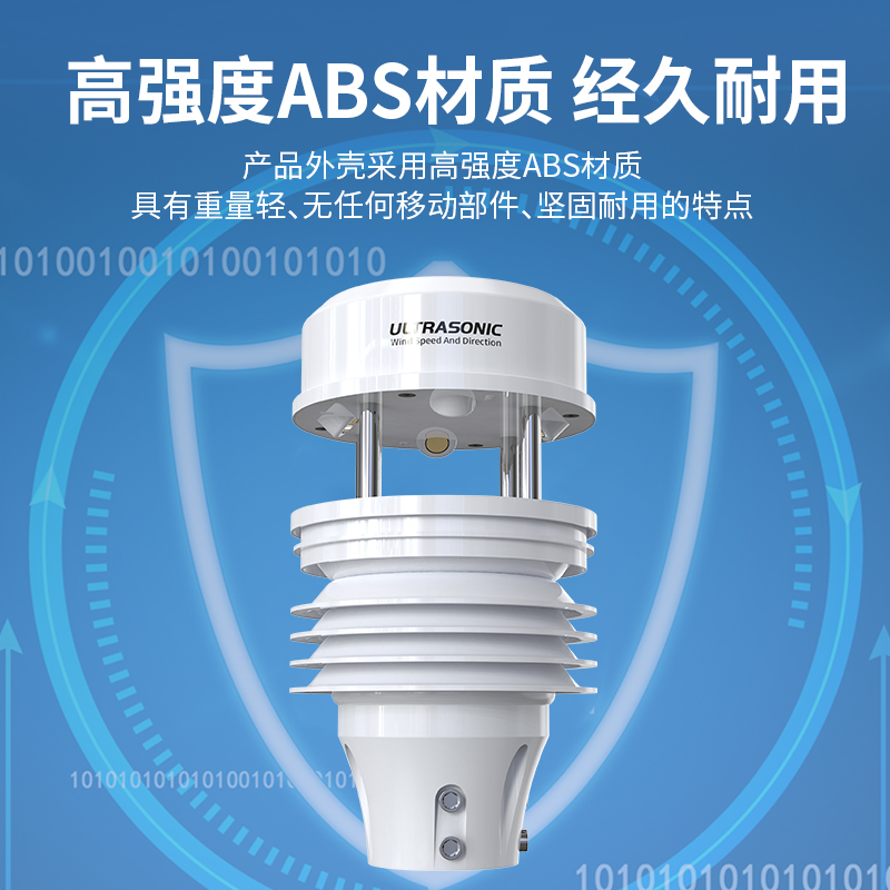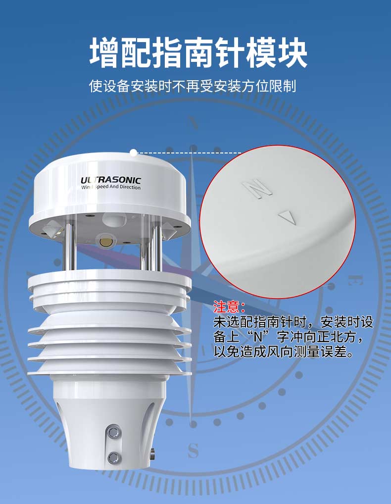 超声波风速风向传感器是一款基于超声波原理研发的风速风向测量仪器,利用200kHz超声波换能器发送的声波脉冲,测量接收端的时间差来计算风速和风向。内置电子指南针选型的设备,安装时不再有方位的要求,只需保证水平安装即可,整机外壳采用优质 ABS 材质,具有重量轻、没有任何移动部件、坚固耐用的特点。