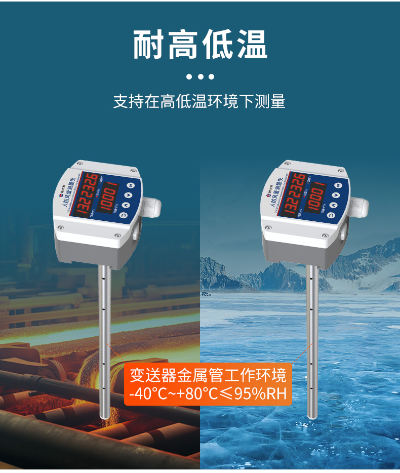 该变送器式针对管道风速测量而设计,自主研发的高精度风速测量单元,反应灵敏,能快速准确地测量微小风速,稳定性好、漂移小、精度高。该变送器同时能根据设置测量的管道截面积计算实时风量值。管道式安装方式,现场安装方便,产品采用抗干扰电路设计,可经受住现场变频器等各种强电磁干扰。设备采用交流 220V 供电,使用更方便。