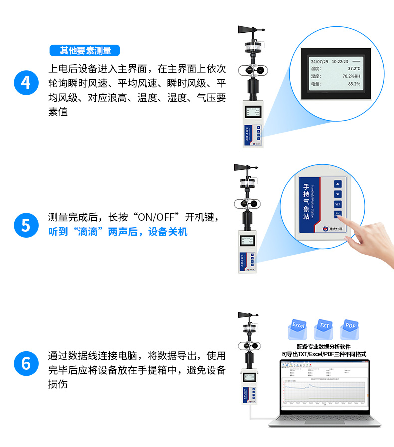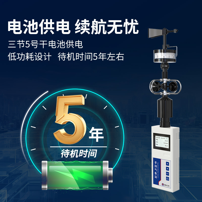 机械式手持气象站是一款便携设计的三杯式风速风向仪,具有体积小、质量轻、耗电省、显示直观、坚固耐用的特点,不需维护和现场校准。能同时输出风速、风向、温度、湿度、气压等实时数据。通过机械式结构设计测量实时风速风向值。自带128*64点阵屏,可实时显示检测数据。
