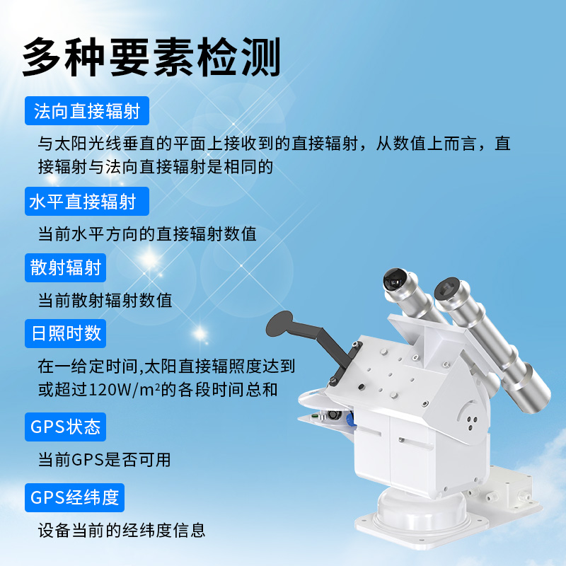 全自动跟踪太阳辐射变送器是一款全自动无人值守自动跟踪太阳进而测量多个太阳辐射参数的设备。满足了自动化测量的要求,解决了传统太阳辐射仪器需要人工实时维护才能准确测量的问题。设备采用太阳跟踪(光追踪)与GPS跟踪双重模式,可以自动计算太阳高度角与方位角、日出日落时间并计算分析比较太阳光强变化,进而精确的全天候跟踪太阳。