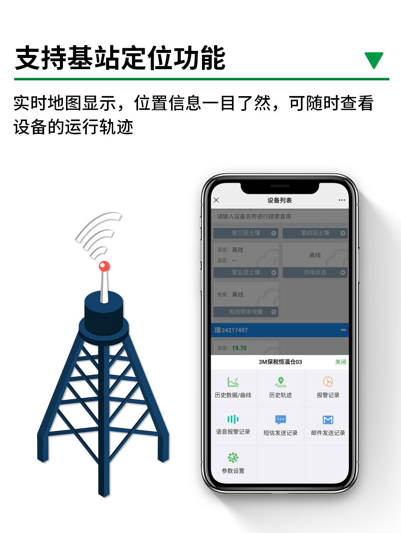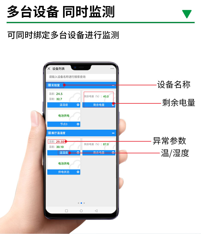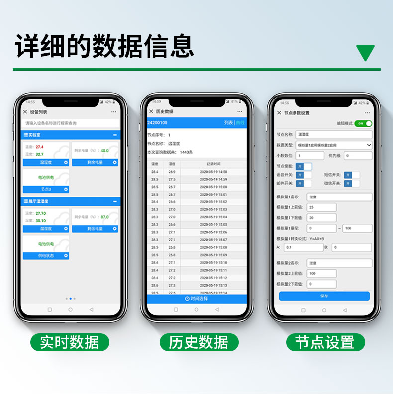 该设备基于4G传输,插上SIM卡,即可连接中国移动、中国联通、中国电信三大运营商的网络基站,实现远距离的数据采集和传输,依托本地/云端软件平台,实现温湿度集中监控。可选配数据存储功能,通过USB导出数据,内部集成报警功能模块(蜂鸣器),可实现超高、低温、高、低湿时报警。