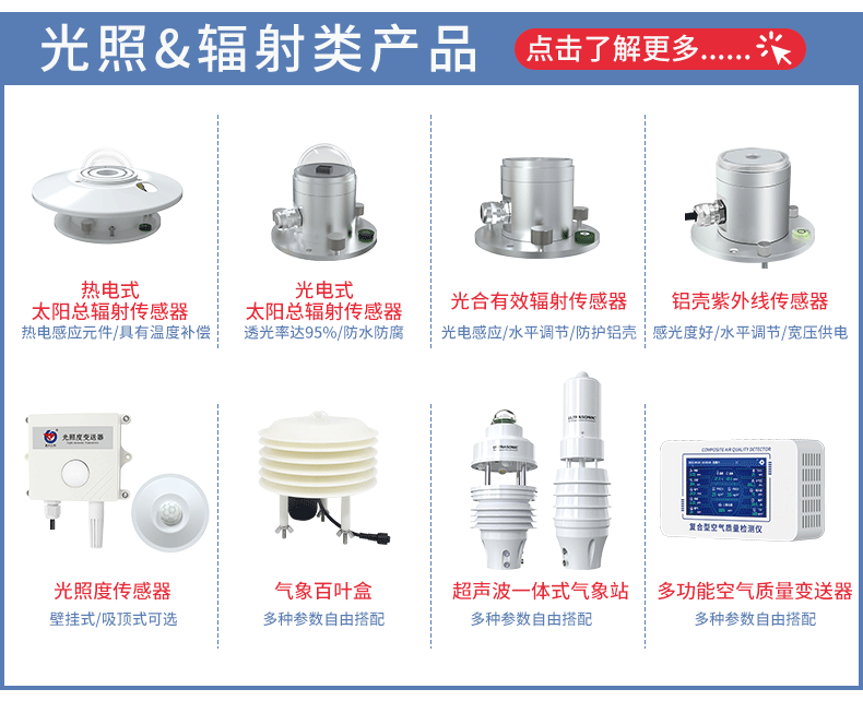设备均采用高精度感光元件,可对环境中的光照强度、光合有效辐射、紫外线轻度等进行在线监测。