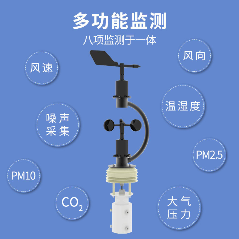 C型一体式多要素气象变送器集风速、风向、温湿度、噪声、PM2.5/ PM10、二氧化碳、大气压力于一体,采用标准 ModBus-RTU通信协议,RS485信号输出,通信距离最远可达 2000 米,可将数据通过 485 通信的方式上传至客户的监控软件或PLC组态屏等,也支持二次开发。