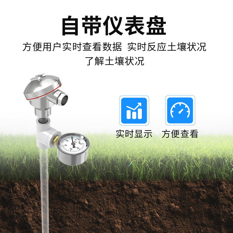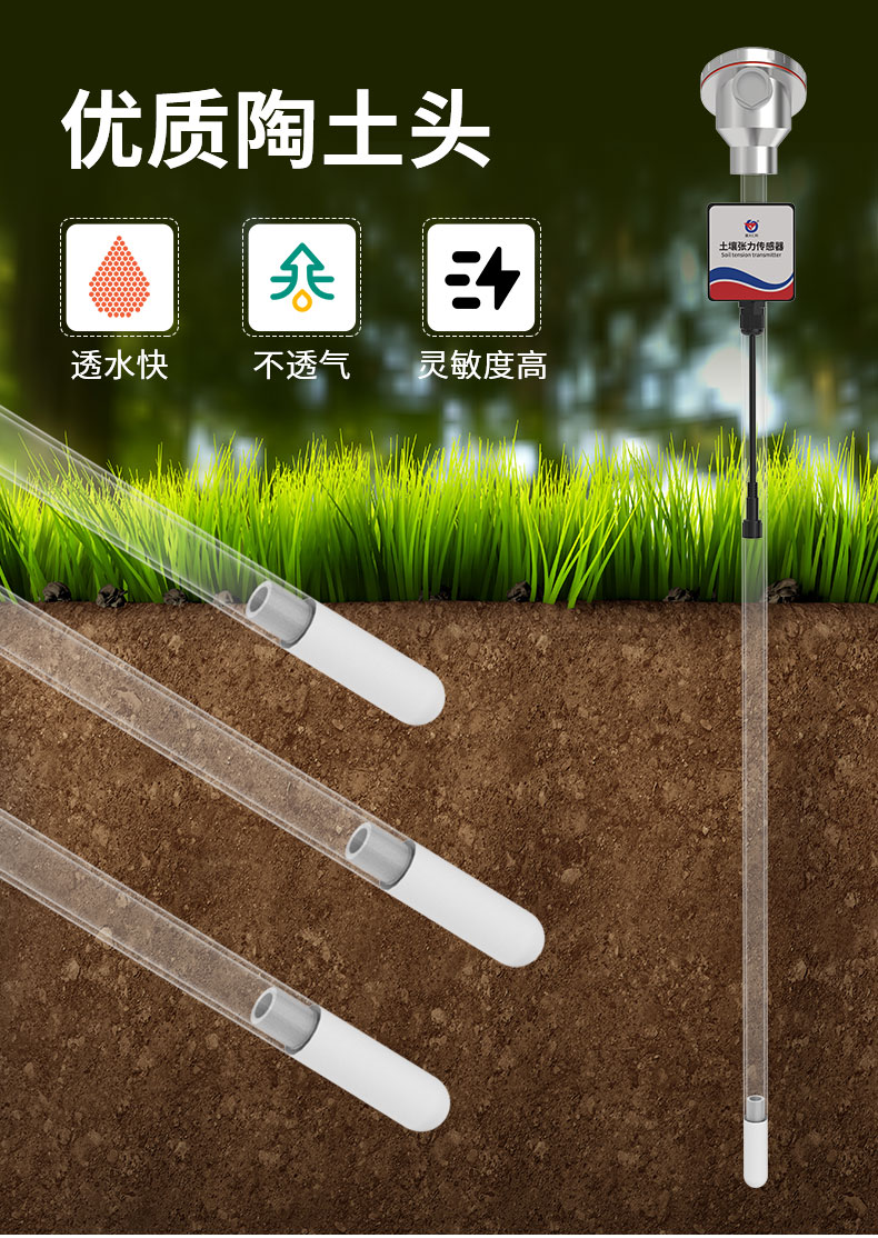 土壤张力变送器外壳采用透明 PVC 塑料管,可直观观测水位,响应速度快,有效感知土壤环境。采用不锈钢材质机械真空表,可长时间用于室外。优质陶土头,透水快不透气,灵敏度高。不受土壤中盐离子的影响,化肥、农药、灌溉等农业活动不会影响测量结果,数据精准。产品适用于需检测土壤墒情与旱情信息的场所,监测作物是否缺水,更好地浇灌作物。