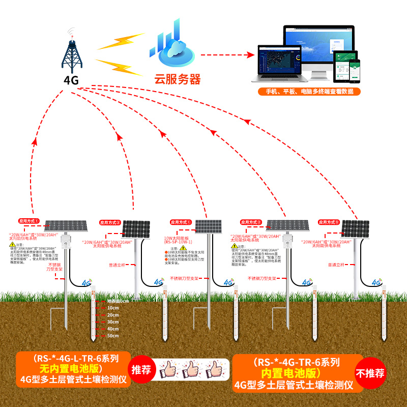 该系统主要以分布在不同区域范围内的,由“多个RS485/4G型“多土层管式土壤监测站”为核心。采用分层设点的观测结构,长期、定点的对不同土层土壤的“温度、水分、电导率、倾角”等数据信息进行采集。依托我司免费提供的云服务、APP客户端,实现土质的远程在线监测、数据记录、曲线分析、远程告警、联动控制等多种物联网应用服务于一体的土壤环境质量监测预警体系。