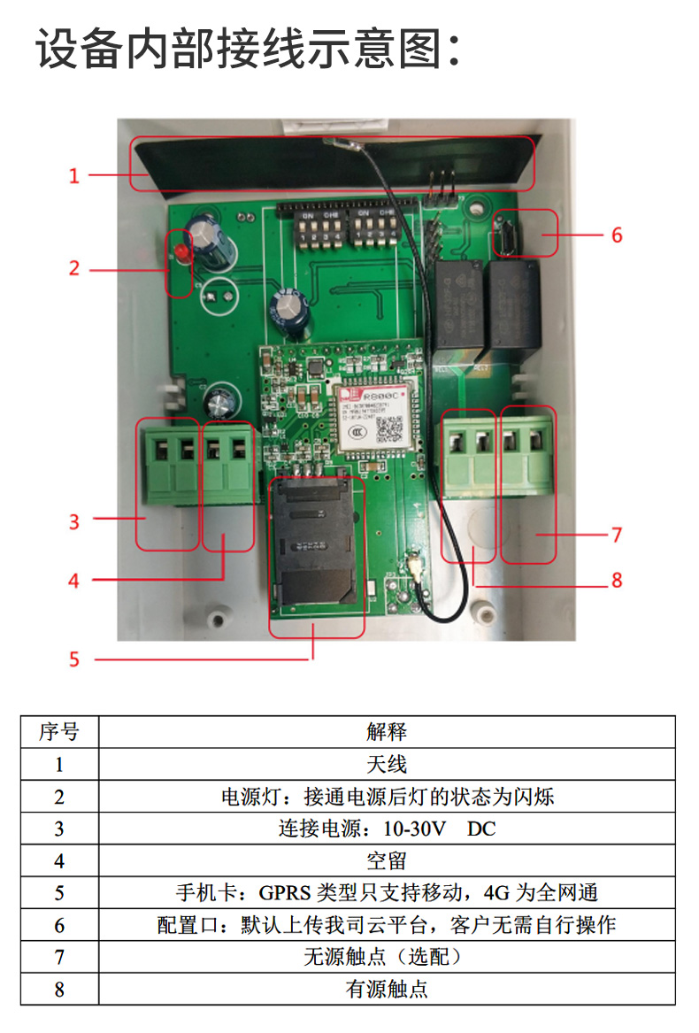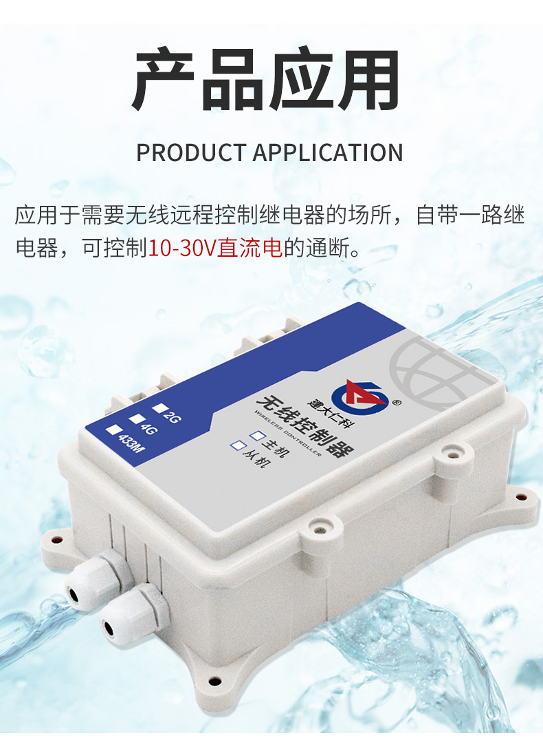 此设备应用于需要无线远程控制继电器的场所,产品自带一路继电器,可控制 10-30V 直流电的通断,设备只需安装在有信号的地方并且插入一张手机卡或者流量卡即可通过我司免费通用云平台或者通过我司的云控通手机 APP 即可直接远程操控继电器的吸合断开,设备也会上传继电器状态至平台,方便使用者实时监控设备的通断状态。