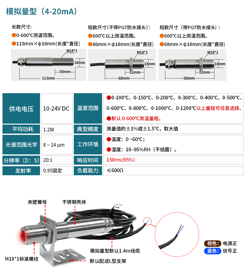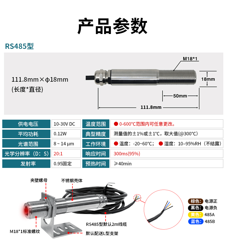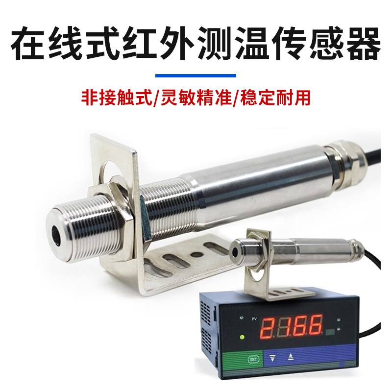 该温度传感器为一体化集成式红外温度传感器,它可以不接触目标而通过测量目标发射的红外辐射强度计算出物体的表面温度;易于安装,金属壳体上的标准螺纹可与安装部位快速连接。