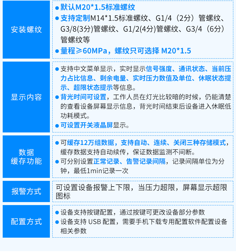 基于LoRa无线通信的无线压力检测装置由压铸铝合金外壳、主控系统、液晶显示屏、测量电路、机械连接件、扩散硅敏感元件等核心部件组成,支持多种规格螺纹安装方式,可适配多种压力量程,支持150℃高温介质测量。默认测量气体、液体、蒸汽等介质的相对压力(表压),并可依据项目实际需要改制测量介质的绝对压力(表压+大气压力)以及负压。