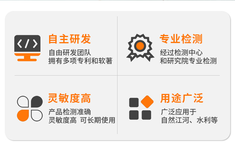雷达流量计系列产品,配合本公司水雨情立杆、主机使用,防护等级 IP68。可检测水流速、水位高度。485 通信,标准 ModBus-RTU 通信协议,最远通信距离 2000 米,产品供电为10-30V 宽电压供电,主要应用于水渠、河流等需要流量及水位监测的场合。