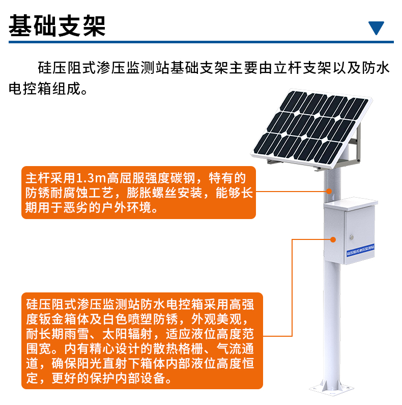 孔隙水压力监测站由“振弦式/硅压阻式渗压计、网络采集器、太阳能供电系统、安装支架、电控箱”等部件组成。实时采集“设计高程的孔隙水压力”,实现数据在线监测、曲线分析、远程预警等功能。可有效评价地基土的允许承载力、预测道路冻害的严重程度、基坑涌水量的大小和坑壁稳定性,以及检验坝基、坝肩防渗处理的效果。
