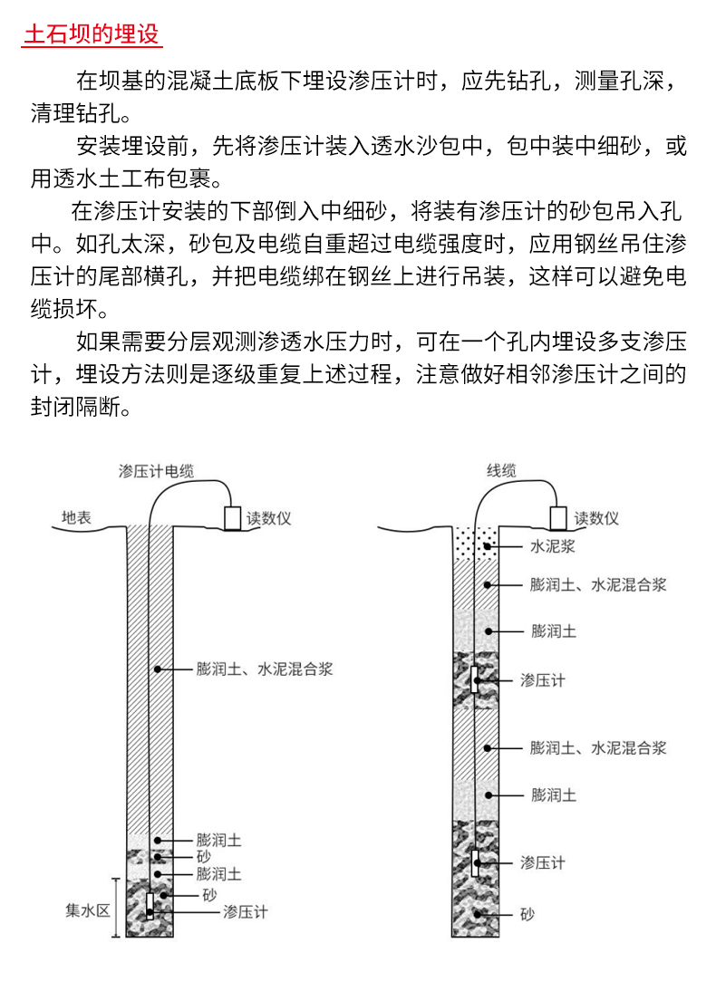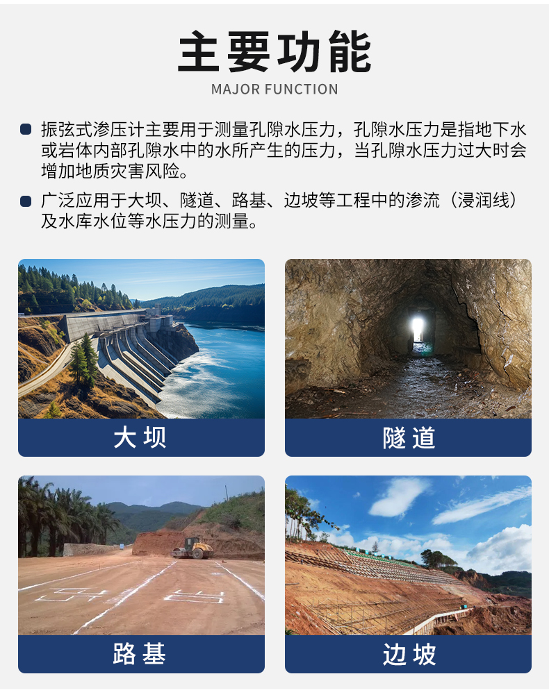 振弦式渗压计是一种测量渗流水或静力压力的传感器,适用于大坝、隧道、路基、边坡等工程中的渗流(浸润线)及水库水位等水压力的测量。若加装温度传感器即可同步测量安装点的温度。 搭配我公司振弦式传感器采集器可实现对现场传感器实时数据进行采集并转换成485、4G、NB-IoT、LoRa 等数据传输方式上传。