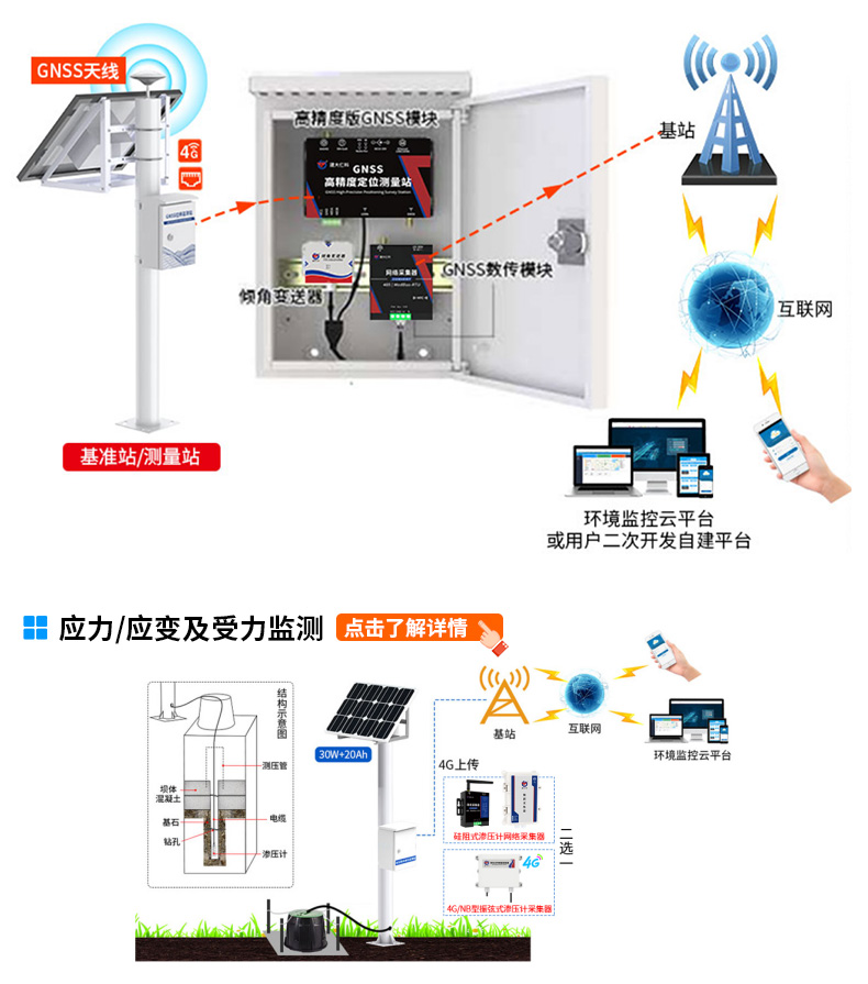 矿山安全自动化监测系统由位移变形监测、应力/应变及受力监测、水文气象监测和综合环境监控云平台四部分组成,主要为矿山开采、矿场环境安全提供实时监测及分析服务。综合应用GNSS位移监测站、渗压计(硅压阻式、振弦式)、锚索计、应变计、土压力计、雨量气象站等智能传感器设备,旨在对露天矿边坡进行表面位移、内部位移、地下水位(渗压)、雨量等数据进行24小时在线自动化监测,建立安全预警系统。