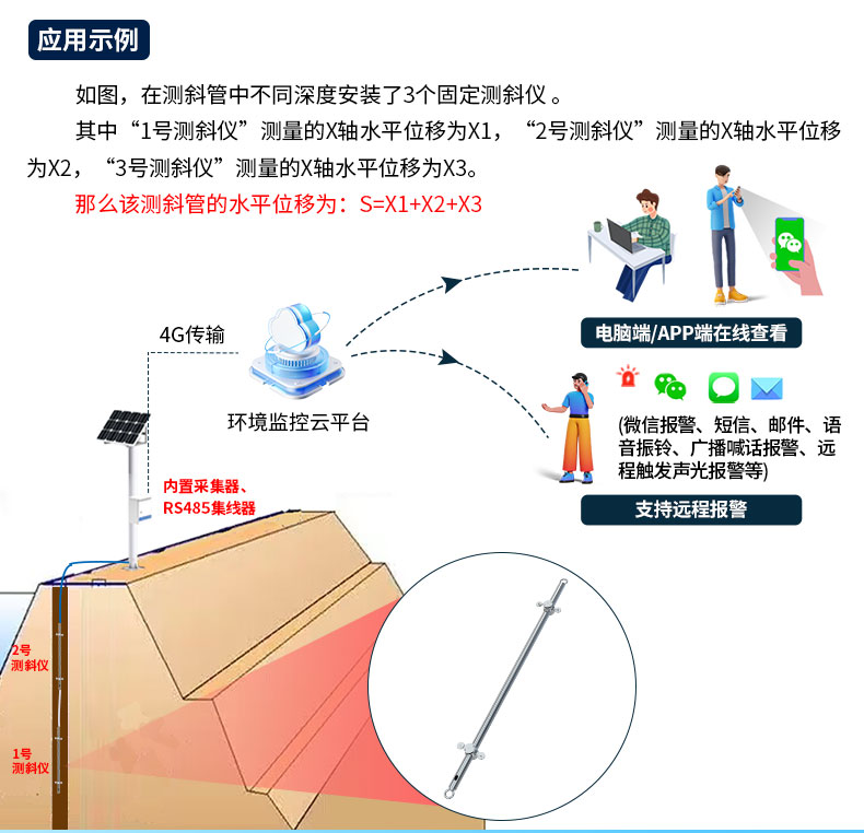 固定式测斜仪采用重力加速度传感器作为敏感元件,测量精度高,广泛用于观测土石坝、 堤防、建筑地基、矿井、基坑开挖、岩土边坡等方面土体及桩体内部的水平位移变化,能实现倾斜测量的自动化,在一个钻孔内安装多个固定测斜仪,可以更加准确的监测倾斜变化,是一款工程施工监测必备的精密测量仪器。