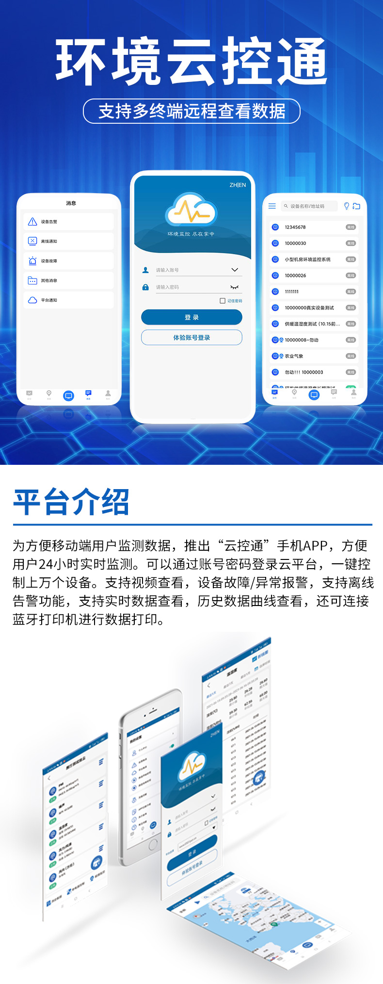 为方便移动端用户监测数据,推出“云控通”手机APP方便用户24小时实时监测。可以通过账号密码登录云平台,-键控制上万个设备。支持视频.查看,设备故障/异常报警支持离线告警功能,支持实时数据查看,历史数据曲线查看还可连接蓝牙打印机进行数据打印。