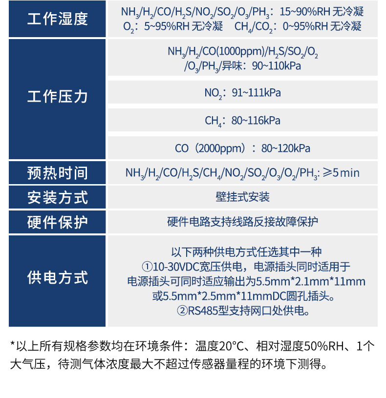 | 工作湿度 | NH3/H2/CO/H2S/NO2/SO2/O3/PH3:15~90%RH 无冷凝 O2:5~95%RH 无冷凝 CH4/CO2:0~95%RH 无冷凝 | |