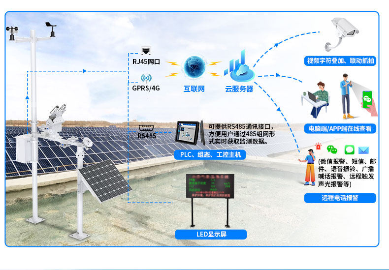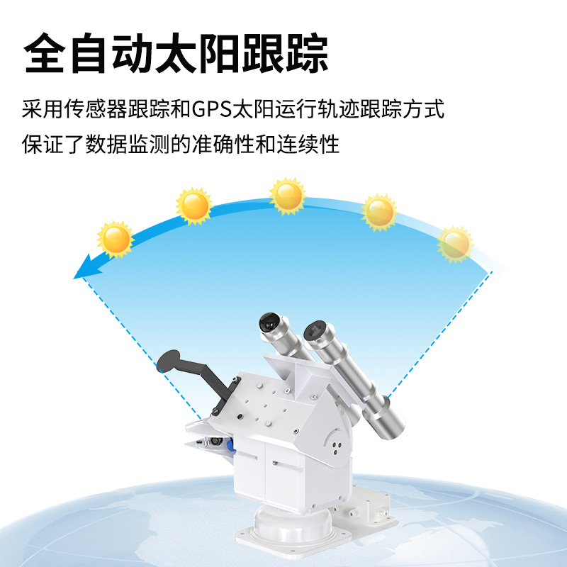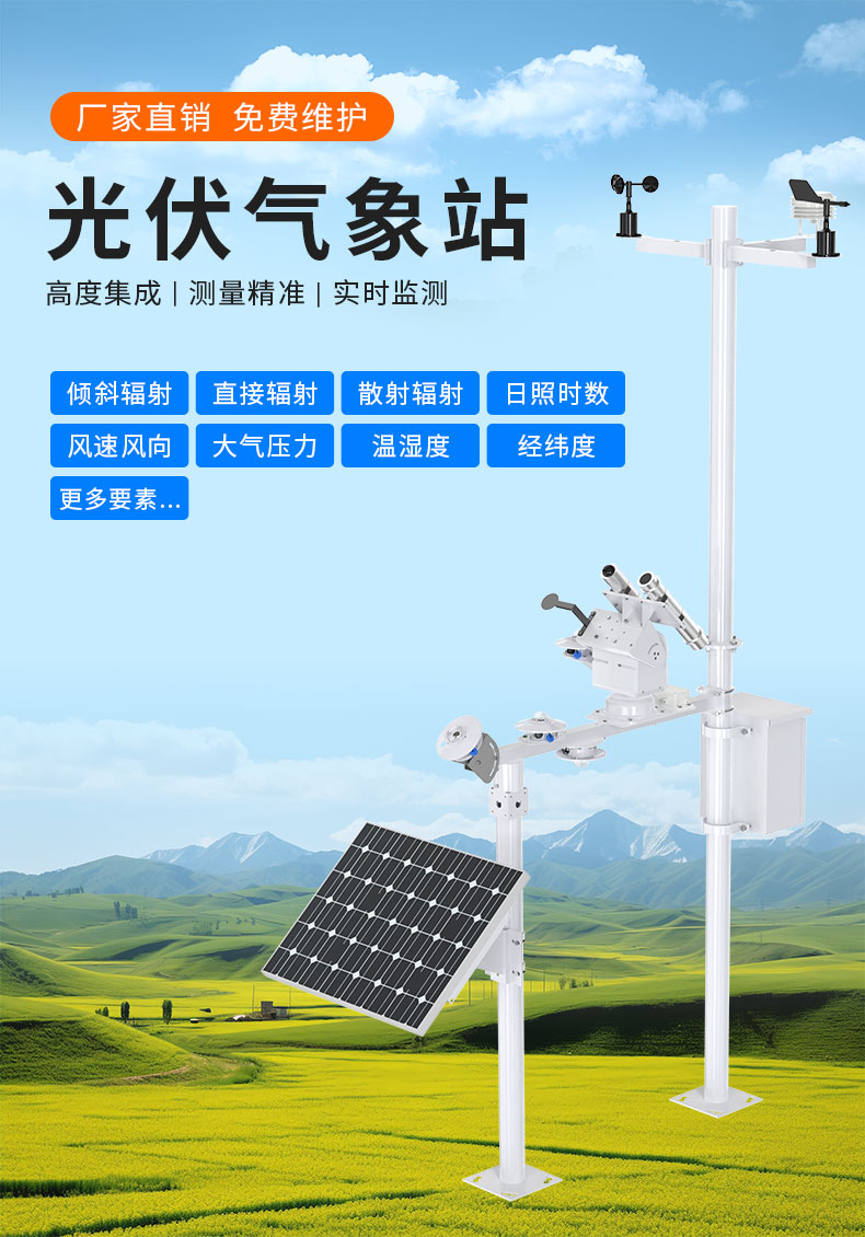 光伏气象站是一款光伏专用监测站。采集太阳倾斜辐射、日照时数、太阳总辐射、太阳直接辐射、太阳散射辐射、反射辐射、反辐射率、风速、风向、百叶盒温湿度大气压力、经纬度、组件温度等要素。其中太阳辐射采用全自动太阳跟踪系统自动跟踪太阳解决了人员到现场实施维护的缺点,并使用传感器跟踪和 GPS 太阳运行轨迹两种跟踪方式保证高精度跟踪。