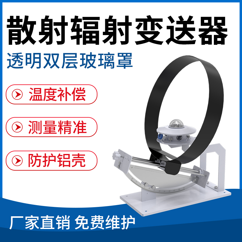 RS-JTBQ-N01-AL散射辐射变送器是由太阳总辐射变送器和散射遮光环两部分组成。太阳总辐射变送器采用热电原理,可用来测量光谱范围在0.3~3μm的太阳辐射。感应面上方采用双层玻璃罩,不但能够减弱空气对流对设备的影响,而且能够阻断外罩本身的辐射。