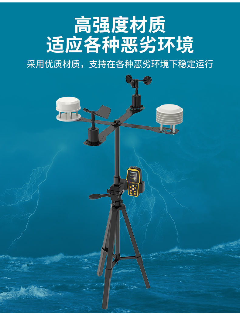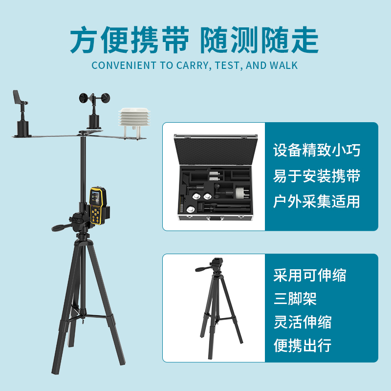 便携式气象站是一款自动气象站观测设备。该设备由手提箱、三脚架、数据采集终端、传感器设备组成。便携式气象站功耗低,随时随地可进行采集环境内数据。集成度高,可快速安装,便于移动监测。搭配手持式速测记录仪,可以实时显示读数,该产品广泛适用于需要测量环境温湿度、噪声、空气质量、二氧化碳、大气压力等各种场合, 安全可靠,外观美观,安装方便,经久耐用。