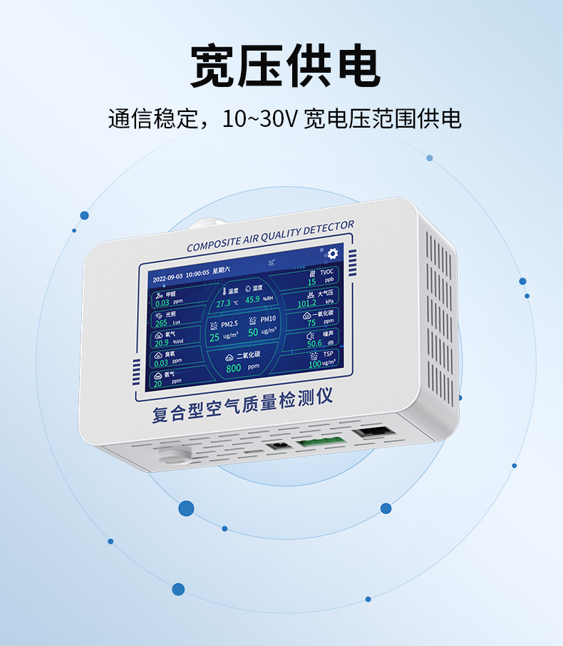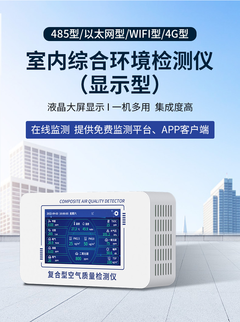 该设备是我公司自主研发的一款空气环境多要素变送器,设备内置大屏液晶,用于检测空气环境中的PM2.5、PM10、温度、湿度、气压、光照、TVOC、氧气、二氧化碳、一氧化碳、甲醛、臭氧、氢气、二氧化硫、二氧化氮、氨气等参数,基本涵盖了反映空气质量的各个指标。