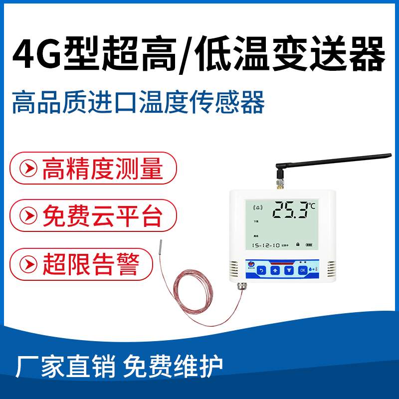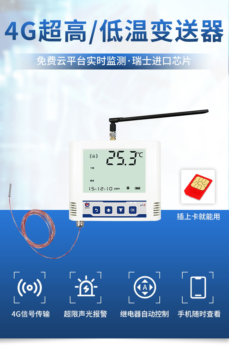 4G型超高/低温变送器产品采用大屏液晶显示,具有温度上下限双控,限值自由设置,温度度凭密码校准,4G数据传输等功能,内部集成报警功能模块(蜂鸣器和继电器),可实现超高低温报警。