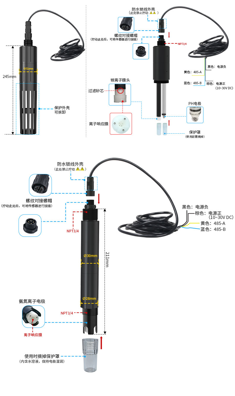 | 电极使用周期 | PH电极6~12个月 氨氮电极3~6个月 钾离子电极3~6个月 |