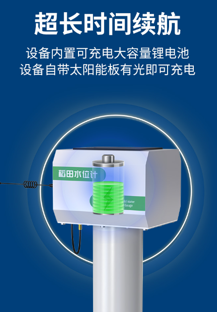 稻田水位计内置可充电大容量锂电池,拥有超强续航能力(7天),且自带太阳能供电系统,有光即可充电,不仅减少了人工维护还有效预防了因连续阴雨天无法充电而导致设备断电的情况发生,满足了用户户外长期使用需求。