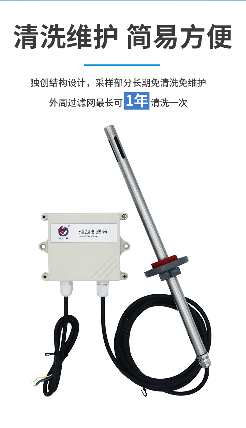 采用高压吸附法,经感应极板电荷采集对油烟浓度进行定量计算。该产品采用管道式安装,可直接安装于油烟排出管道,采集结构采用耐高温高湿涂层,可长期工作于 80 ℃以上的油烟环境。产品采用 485 通信接口,标志 ModBus-RTU 通信协议,可与 PLC、用户主机、组态软件等直接进行通信,方便二次开发。